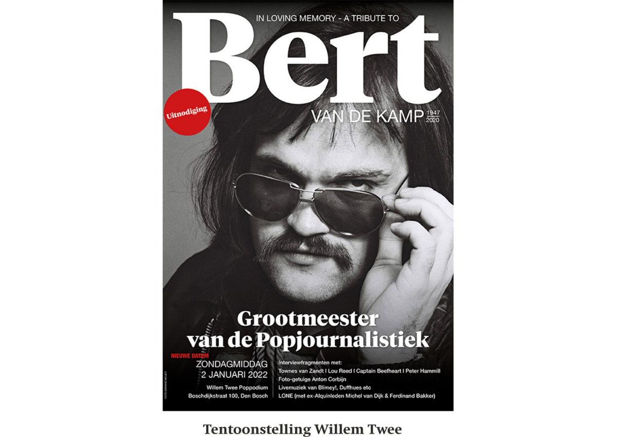 Zo eindigde de tekst op de rouwkaart naar aanleiding van het overlijden van Bert van de Kamp op 9 april 2020. Nu, anderhalf jaar later, is er eindelijk gelegenheid tijdens een memorabele avond de éminence grise van de Nederlandse popjournalistiek te herdenken. Op donderdagavond 18 november doen we dat in Willem Twee Poppodium met In loving memory – a tribute to Bert van de Kamp. Hierbij wil ik je van harte uitnodigen op deze gedenkwaardige avond aanwezig te zijn.